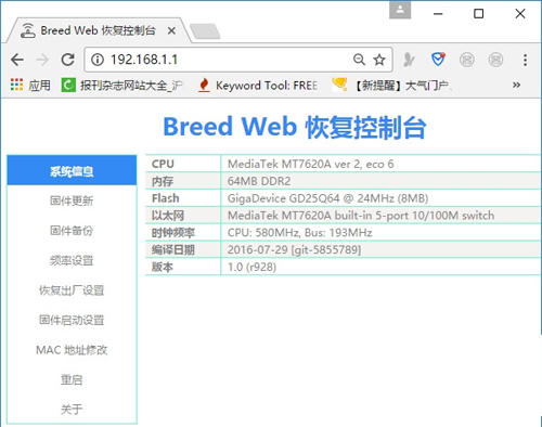 4、在浏览器中输入192.168.1.1,就可以进入到Breed Web控制界面了,如下图所示。