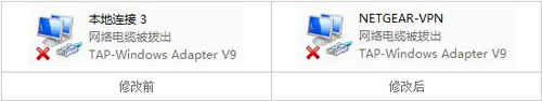 X代表一个数字编号,具体为多少取决于您的计算机上已经有多少个相类似的网络适配器,我们需要找到的是设备名称“TAP-Windows Adapter V9”的图标,在这个图标上点击鼠标右键,然后点击重命名修改此连接名称为“NETGEAR-VPN”。